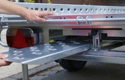 Em cada atrelado SySTEMA® existe um compartimento preparado para a instalação posterior de rampas de carga. As rampas, em alumínio ou aço, são guardadas de forma segura e prática atrás do suporte da matrícula, através de calhas deslizantes. Isto permite um carregamento e descarregamento rápido e eficiente.
