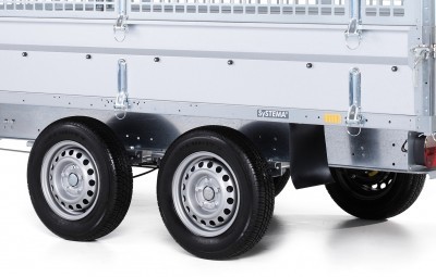 Todos os atrelados SySTEMA® com travão, a partir de 850 kg de peso bruto permitido, vêm equipados de série com amortecedores de marca. Estes atrelados podem ser homologados diretamente na conservatória/autoridade de matrícula para circular a 100 km/h.